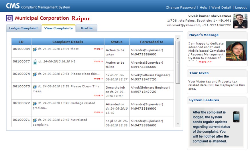 - Configurable complaint category and sub category, areas, officials to handle complaints